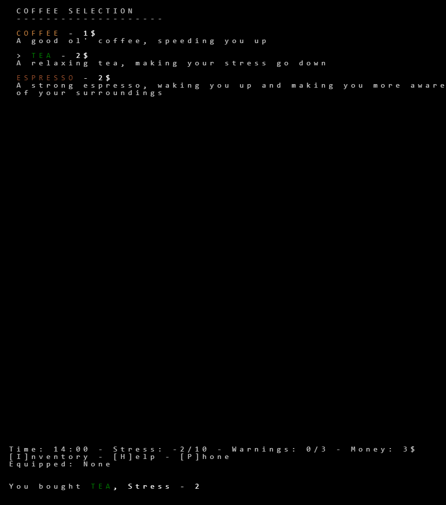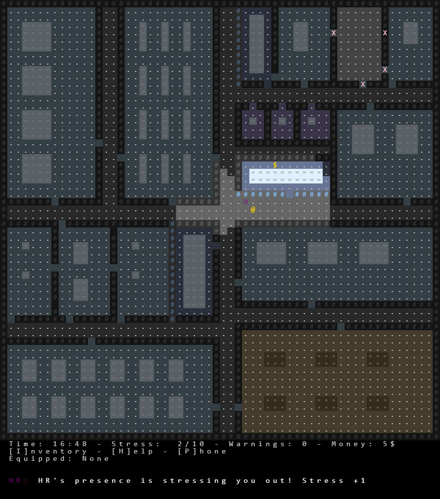 Use the items you find and the procedurally-generated layout of the company floor to you advantage in order to divert the attention, dodge the meetings, and get out to the cold beer waiting for you at the pub.